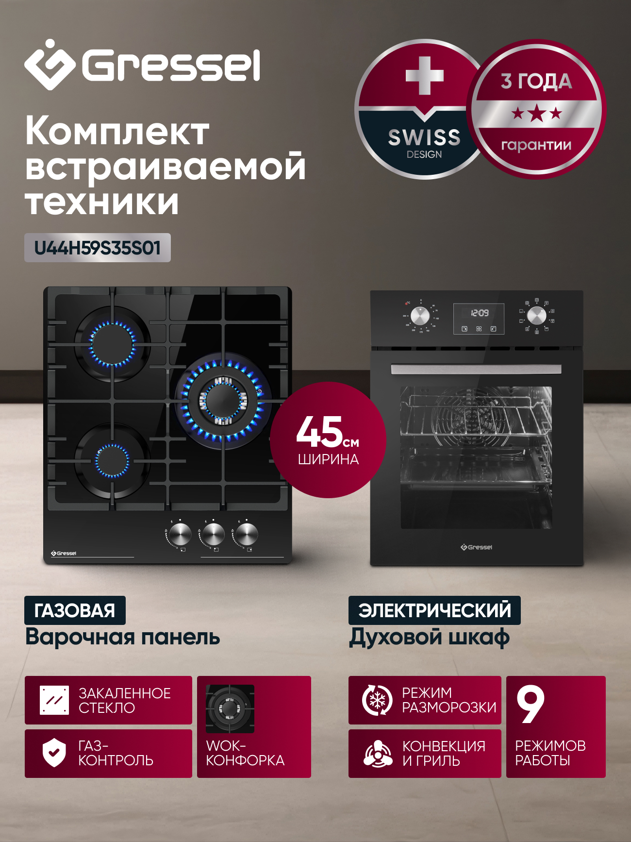 Комплект бытовой техники GRESSEL (духовой шкаф U4ES59001 и варочная панель U45H35S001)