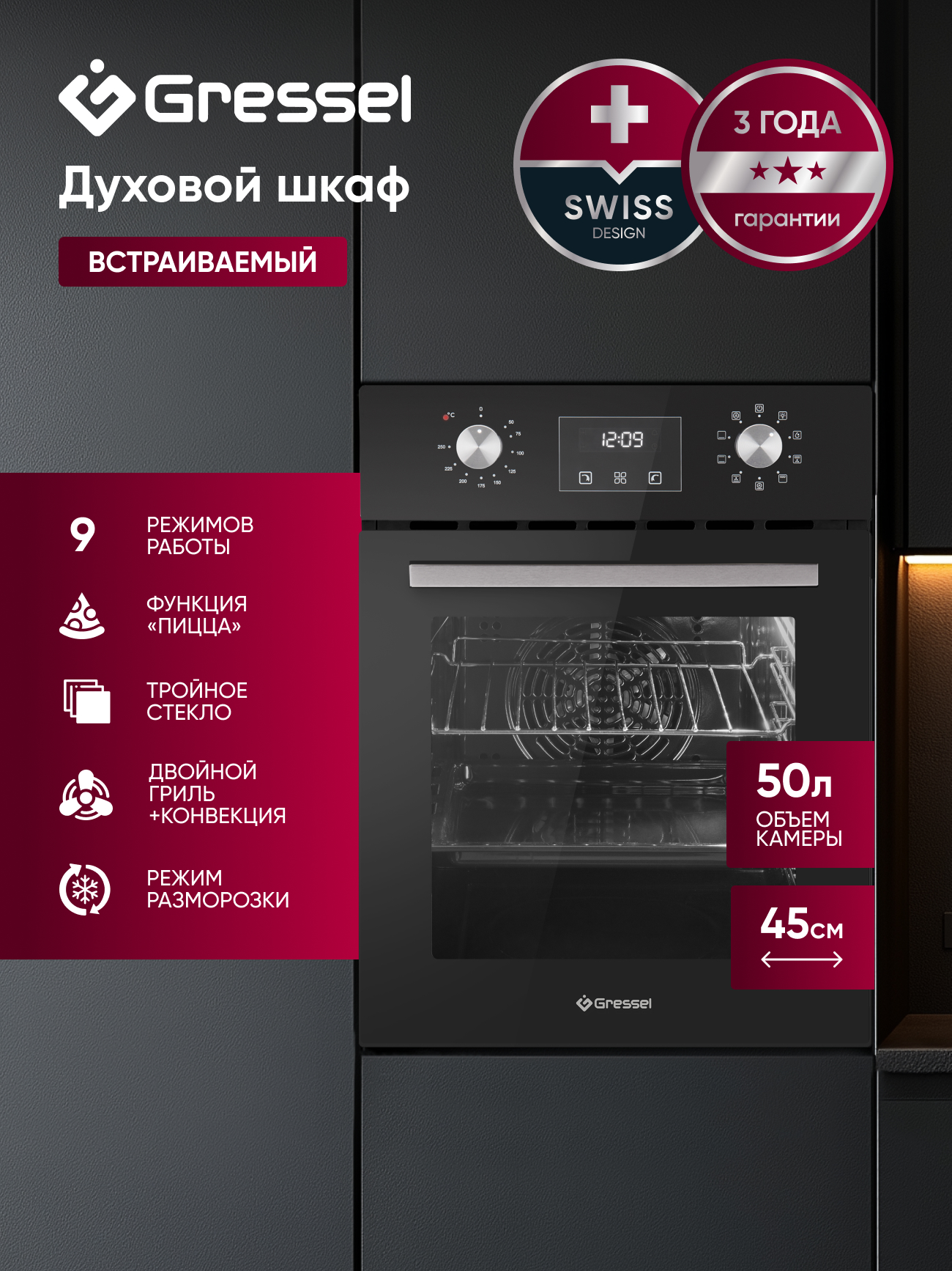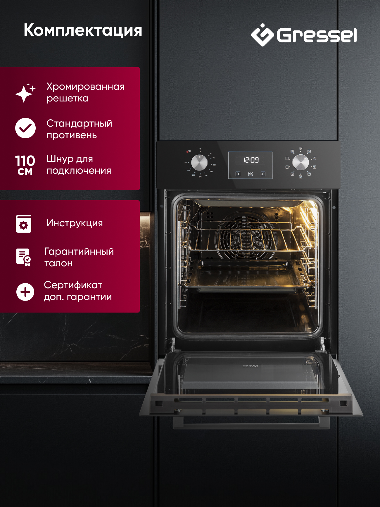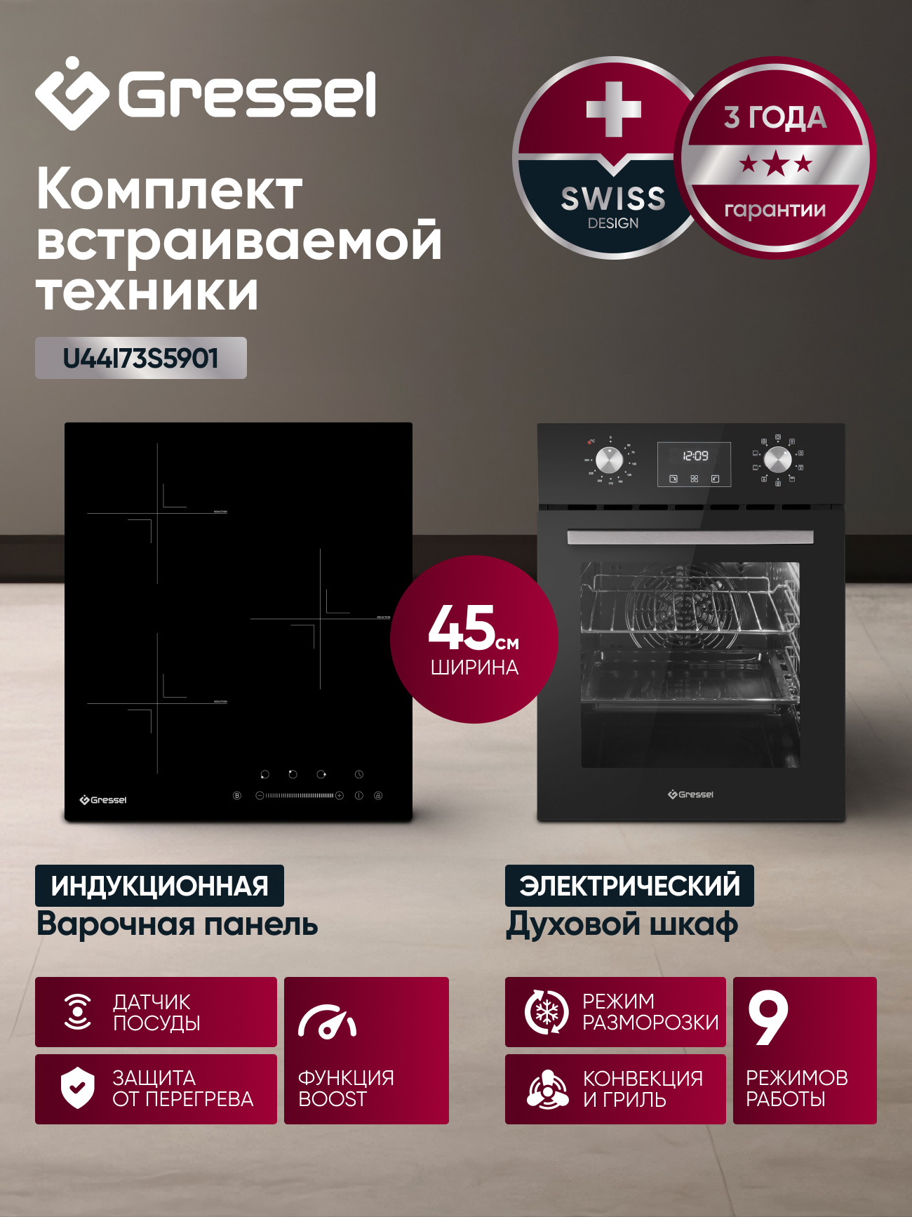 Комплект Gressel U44I73S5901 — это компактное и функциональное решение для небольшой кухни, сочетающее духовой шкаф шириной 45 см и узкую индукционную панель. Электрическая духовка U4ES59001 объёмом 50 литров предлагает девять режимов приготовления, включая конвекцию, гриль, режим пиццы и разморозку. Благодаря равномерному распределению тепла и 3D-конвекции блюда готовятся быстро и качественно. Утапливаемые ручки управления обеспечивают аккуратный внешний вид, цифровой таймер с автоотключением помогает задать точное время приготовления, а тройное остекление дверцы удерживает тепло внутри и остаётся прохладным снаружи.