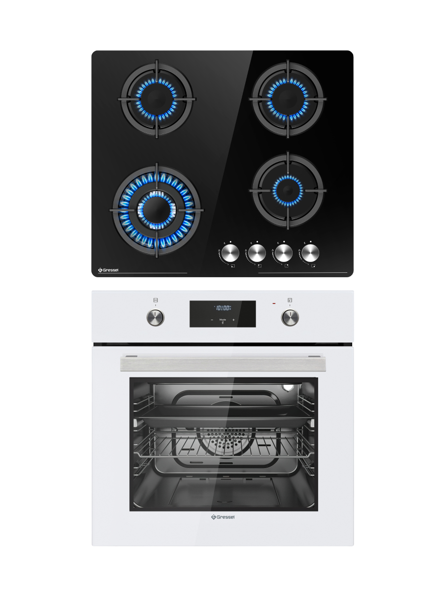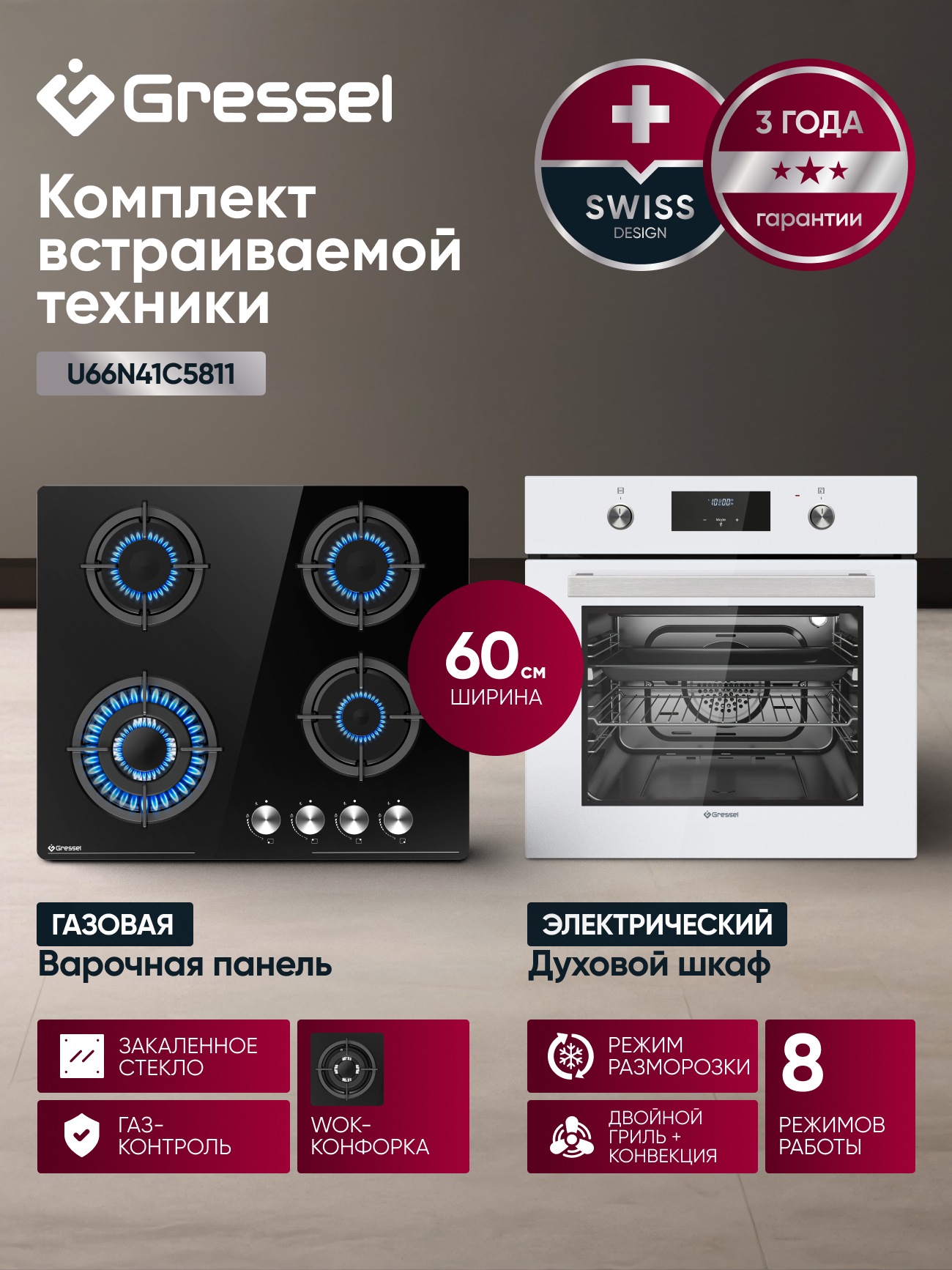 Комплект Gressel U66N41C5811 — это сочетание вместительной духовки и классической газовой панели, которое подойдёт для повседневной готовки и позволит с комфортом готовить любые блюда. Электрический духовой шкаф U6ES58110 объёмом 70 литров предлагает восемь рабочих режимов, включая конвекцию, двойной гриль, разморозку и режим пиццы. Утапливаемые ручки обеспечивают удобное и безопасное управление, а цифровой таймер с функцией автоотключения позволяет задать точное время приготовления. Двойное остекление дверцы сохраняет тепло и защищает от ожогов, а внутренняя поверхность легко очищается.