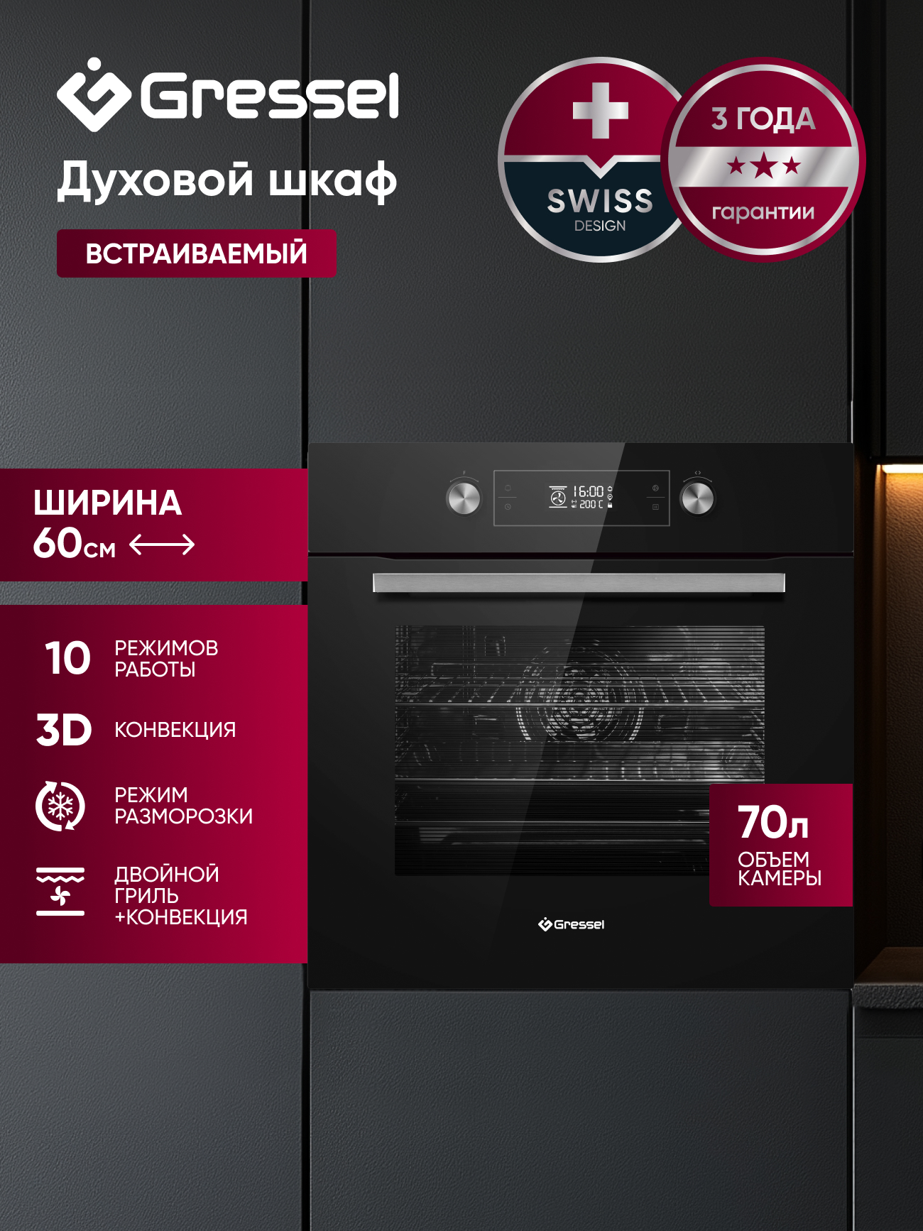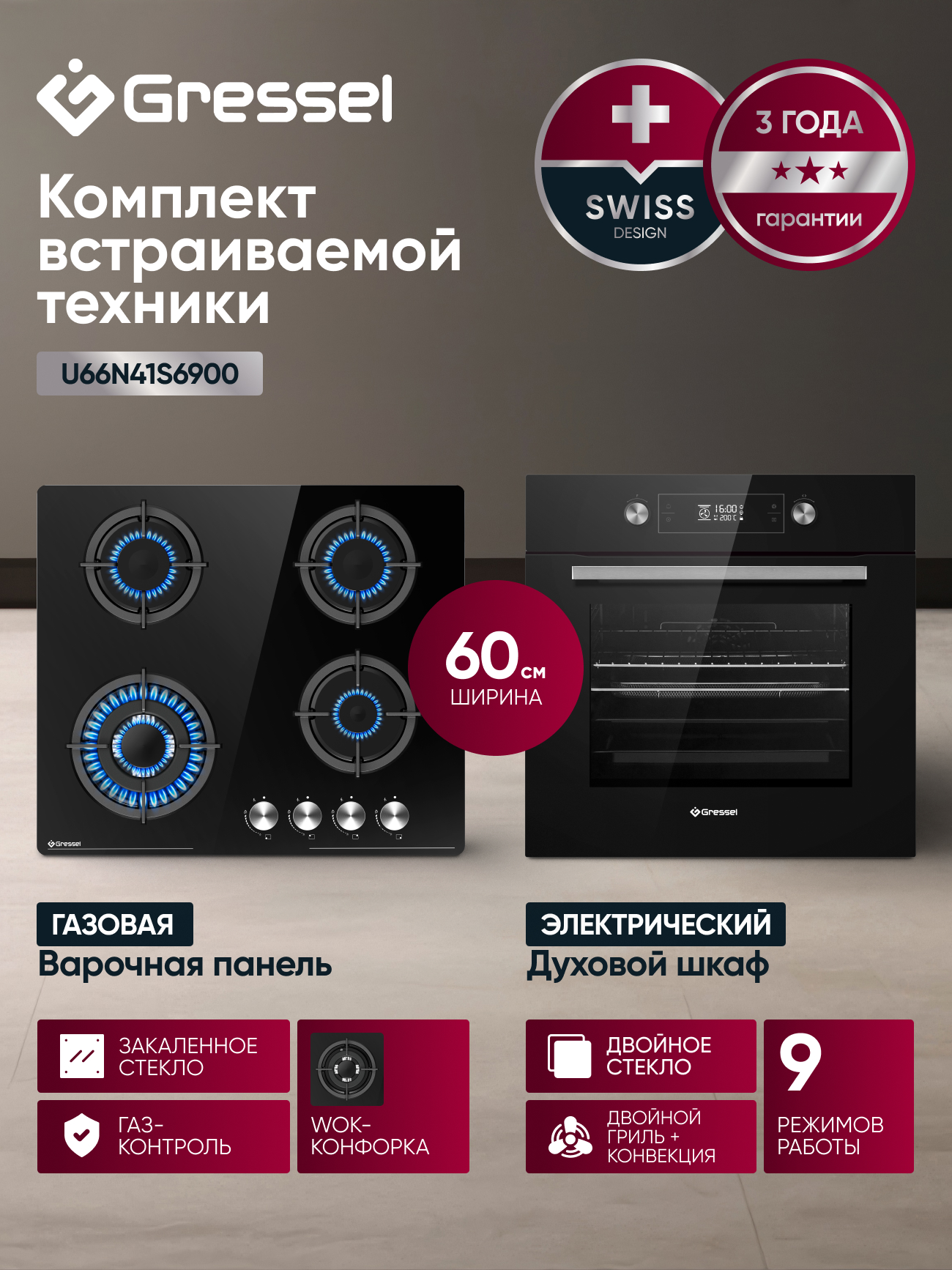Комплект Gressel U66N41S6900 — это надёжное решение для кухни, в котором сочетаются вместительная духовка и удобная газовая панель.