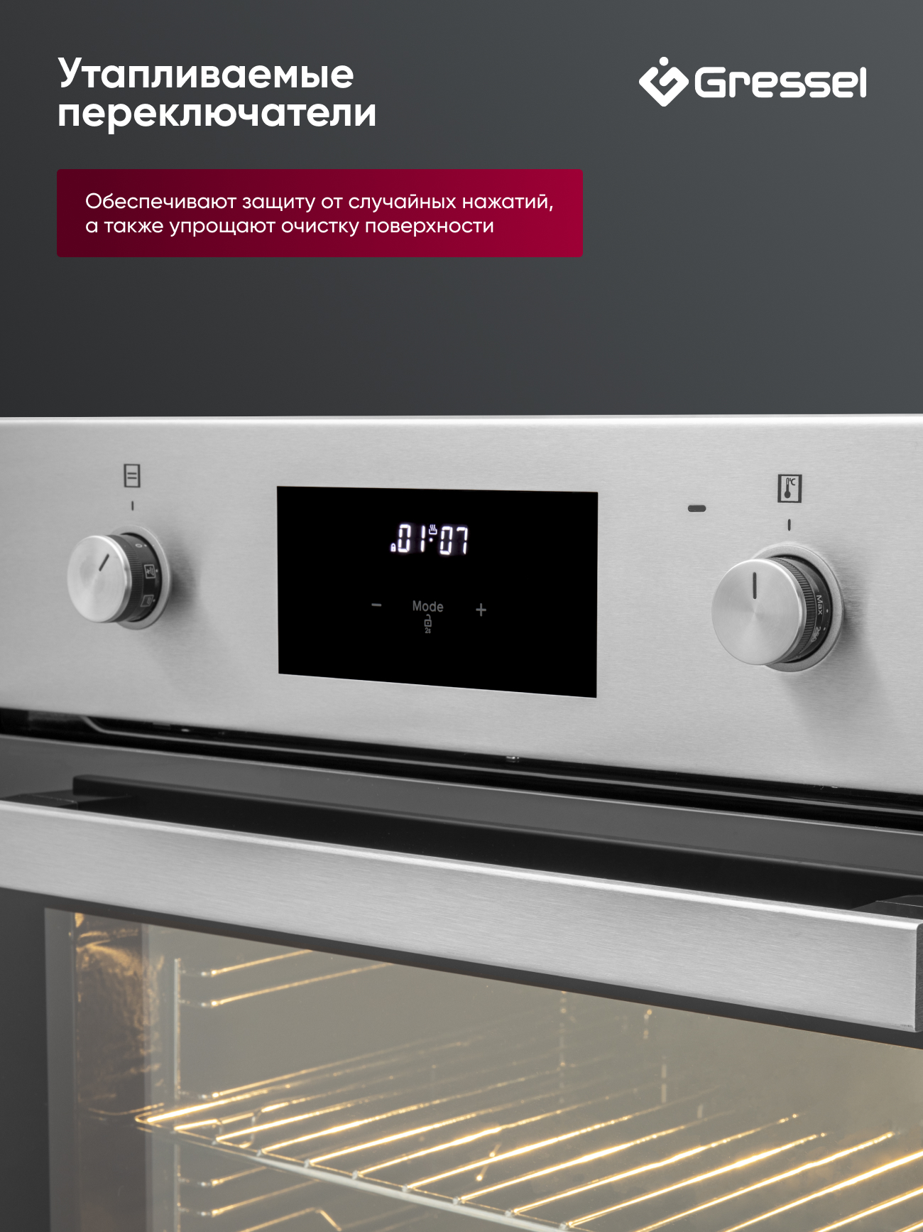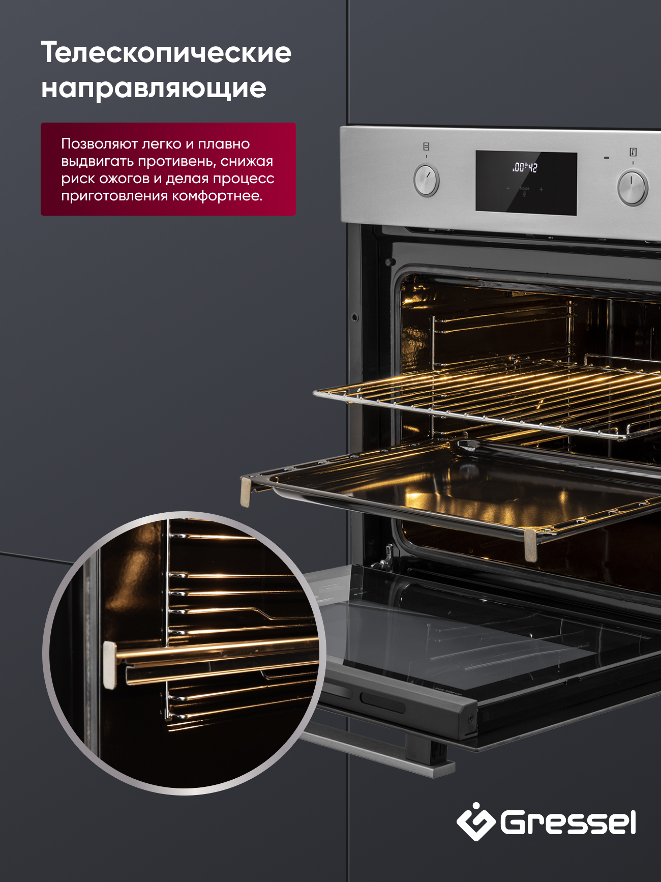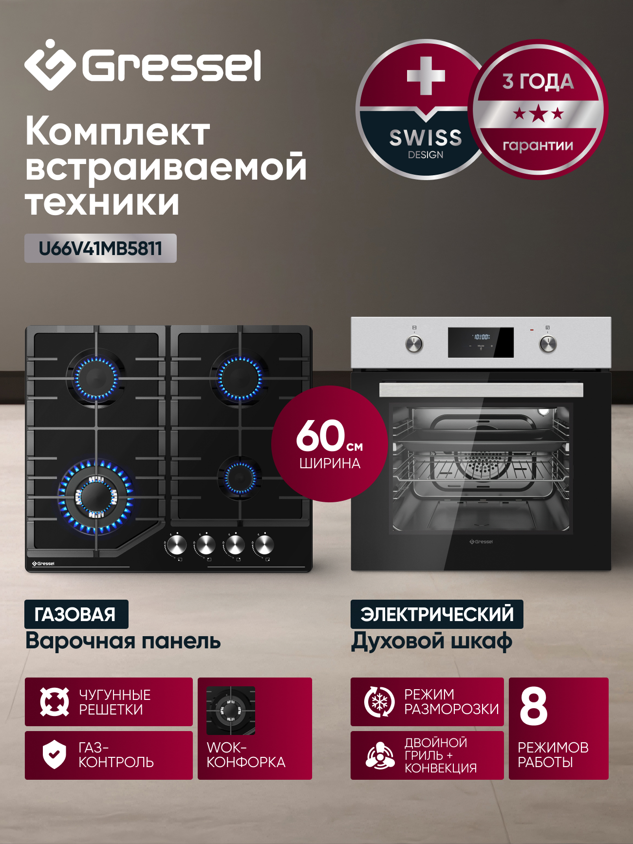 Комплект Gressel U66V41MB5811 — это надёжное и удобное решение для кухни, в котором сочетаются просторная электрическая духовка и функциональная газовая панель. Духовой шкаф U6EM58110 объёмом 70 литров предлагает восемь режимов приготовления, включая конвекцию, двойной гриль, разморозку и режим пиццы. Он позволяет готовить на нескольких уровнях одновременно и обеспечивает равномерное пропекание. Утапливаемые ручки управления делают использование безопасным и аккуратным, а цифровой таймер с автоотключением помогает не переживать за время приготовления. Двойное остекление дверцы удерживает тепло и остаётся прохладным снаружи.