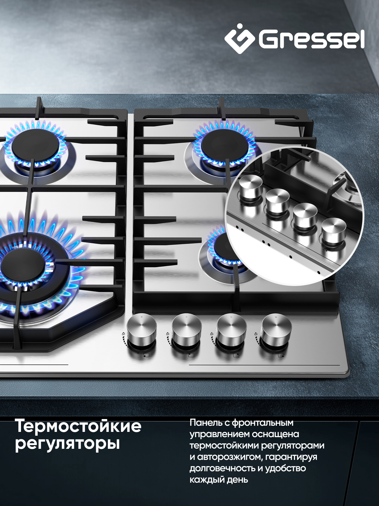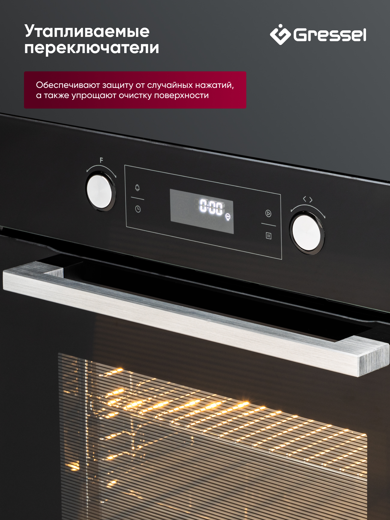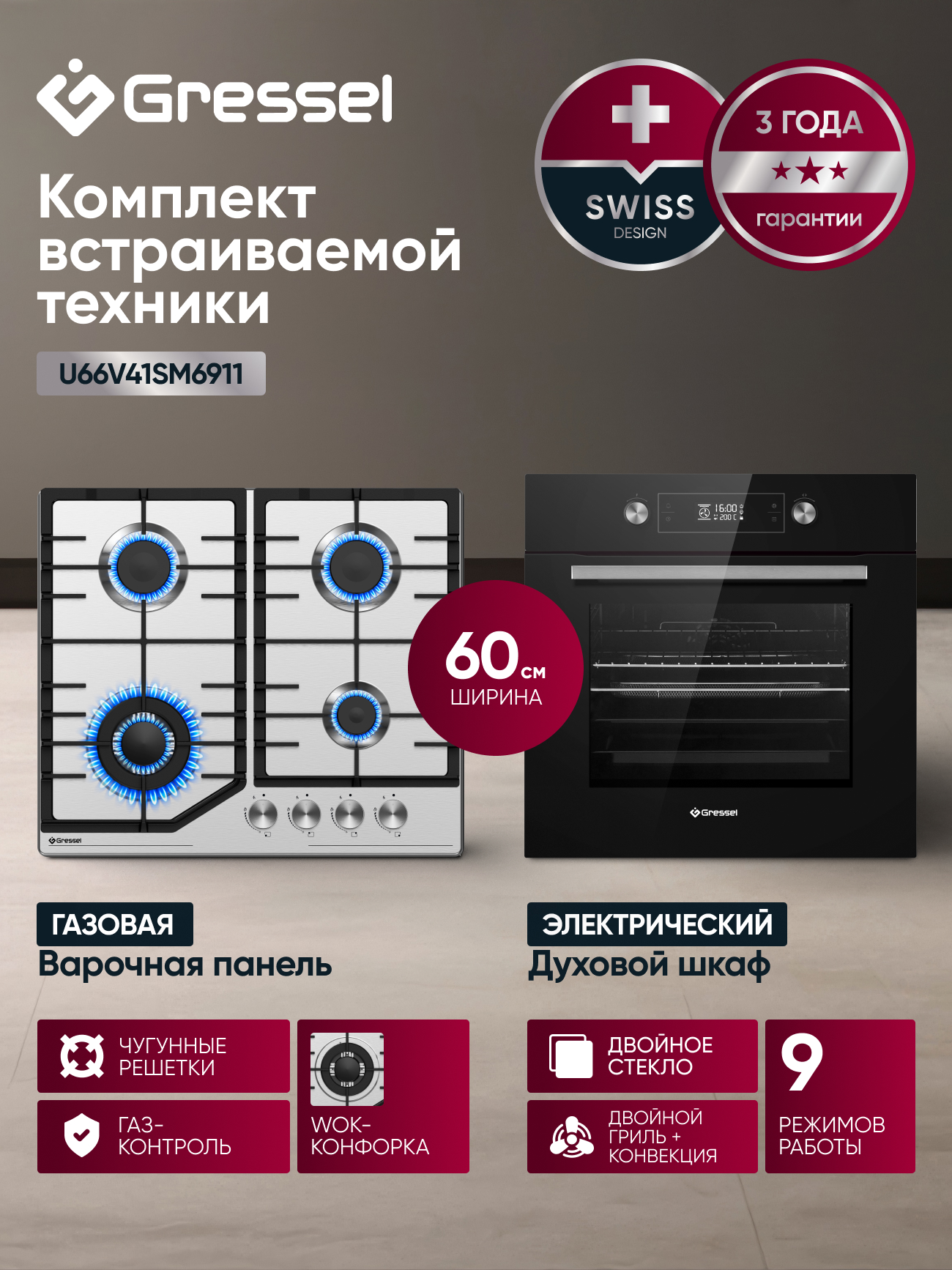 Комплект Gressel U66V41SM6911 — это удобное и сбалансированное решение для кухни, в котором сочетаются вместительная электрическая духовка и функциональная газовая панель. Духовой шкаф U6ES69000 объёмом 70 литров оснащён девятью режимами приготовления, включая конвекцию, двойной гриль, разморозку и режим пиццы. Благодаря равномерному распределению тепла духовка подходит как для выпечки, так и для запекания на нескольких уровнях. Утапливаемые ручки управления удобны в использовании, цифровой таймер с функцией автоотключения помогает точно задать время приготовления, а двойное остекление дверцы сохраняет тепло внутри и остаётся безопасным снаружи.