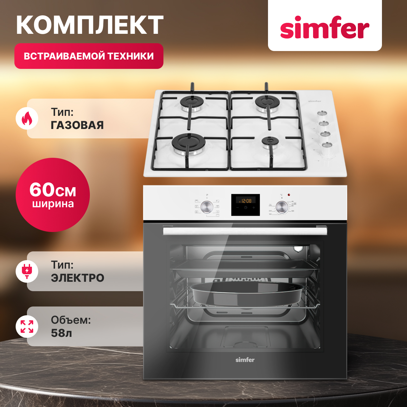 Встраиваемый набор Simfer H60Q40W400, B6EW56070 - комплект, состоящий из газовой варочной поверхности и электрического духового шкафа, созданный для того, чтобы облегчить жизнь каждой хозяйке в приготовлении самых разнообразных блюд. И для тех, кто мечтает о технике, гармонично сочетающейся с элементами кухни. Для того, чтобы воплотить свои кулинарные фантазии предусмотрены четыре газовые конфорки разные по диаметру и мощности пламени в них, располагающиеся на рабочей поверхности из эмалированной стали. Удобное управление и функция электроподжиг значительно упрощает работу с панелью. А разнообразные режимы в духовом шкафу дадут вам возможность выбора оптимального способа приготовления для каждого блюда. Контролировать этот процесс, благодаря освещению камеры, вы сможете, не открывая дверцу духовки. Готовьте вкусную еду и проводите семейные ужины в комфортной и уютной обстановке!