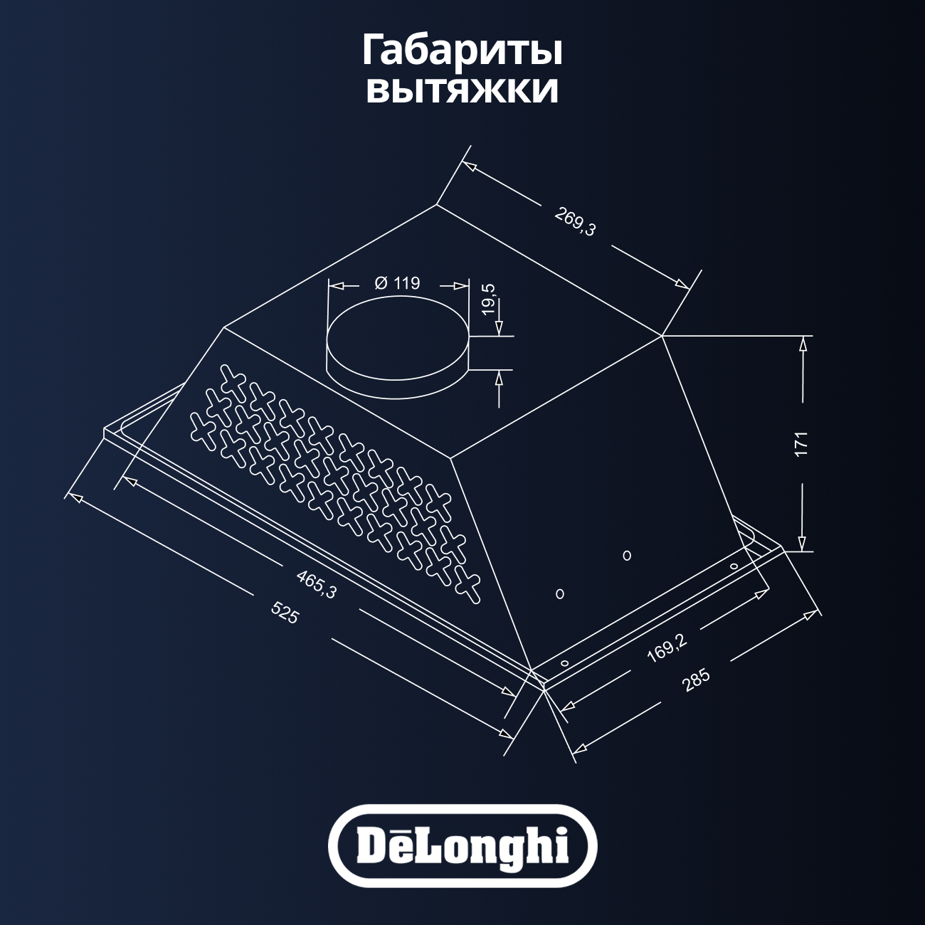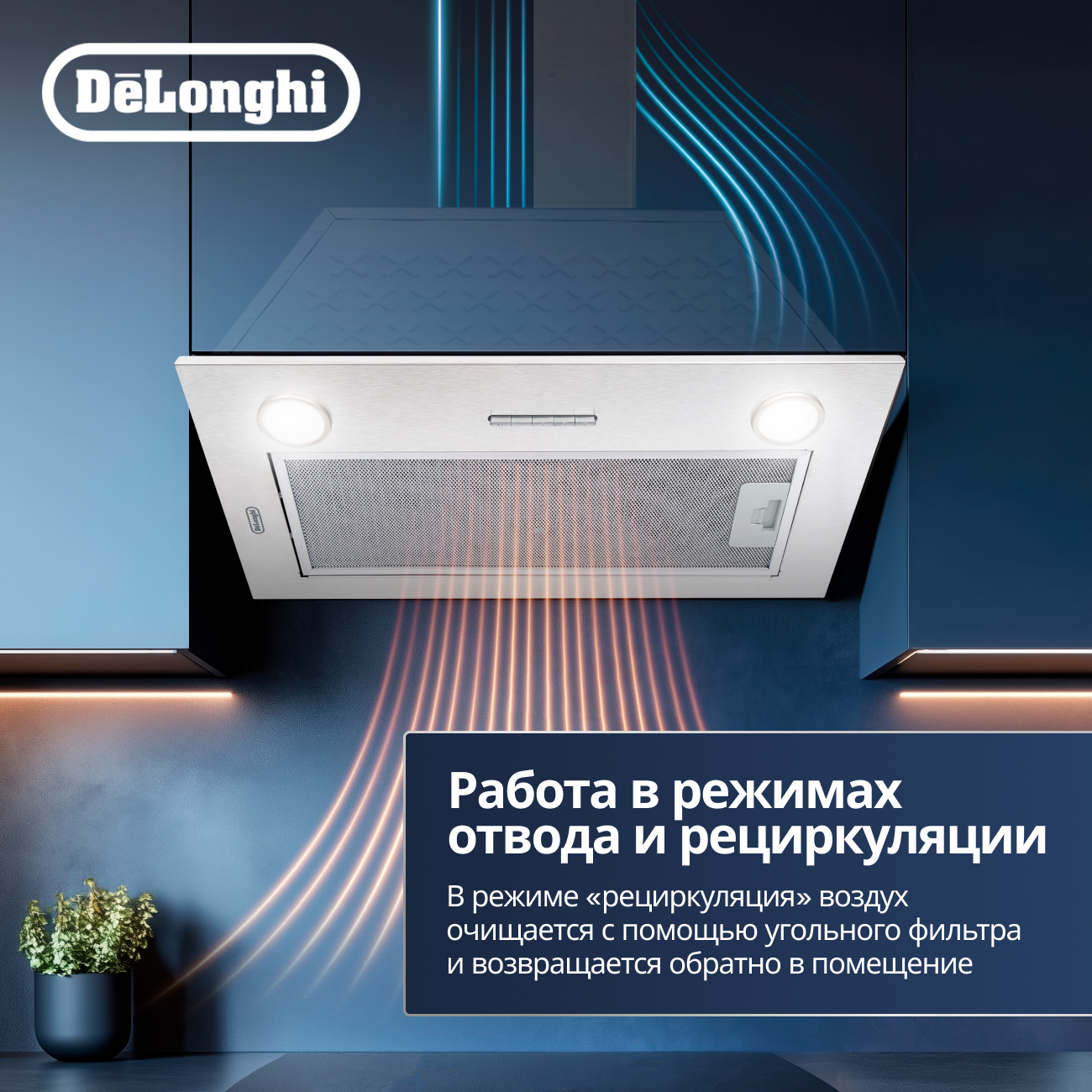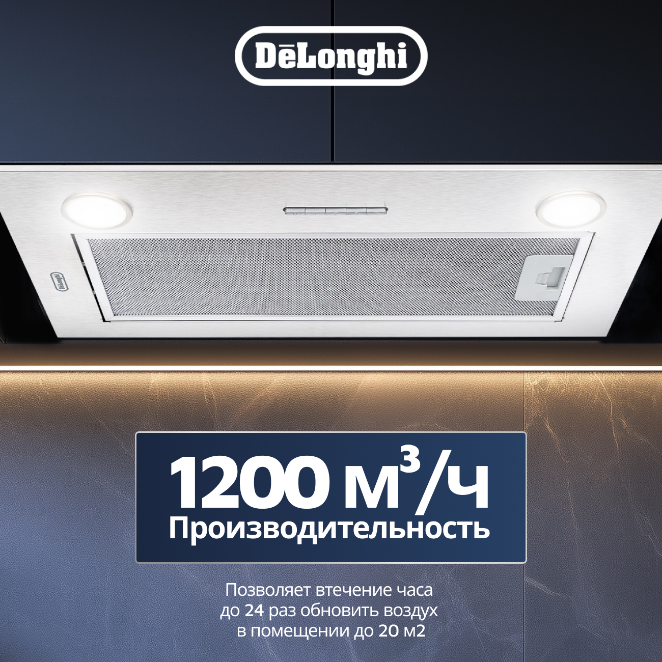 Встраиваемая вытяжка DeLonghi COSETTA 510 IM с габаритами 28.5x52.6x27.06 см и мощностью двигателя 193 Вт обеспечивает максимальную производительность 1200м³/ч. Освещение осуществляется с помощью двух LED ламп. Уровень шума при работе составляет всего 63 дБ. Вытяжка может работать в режимах отвода и циркуляции воздуха.