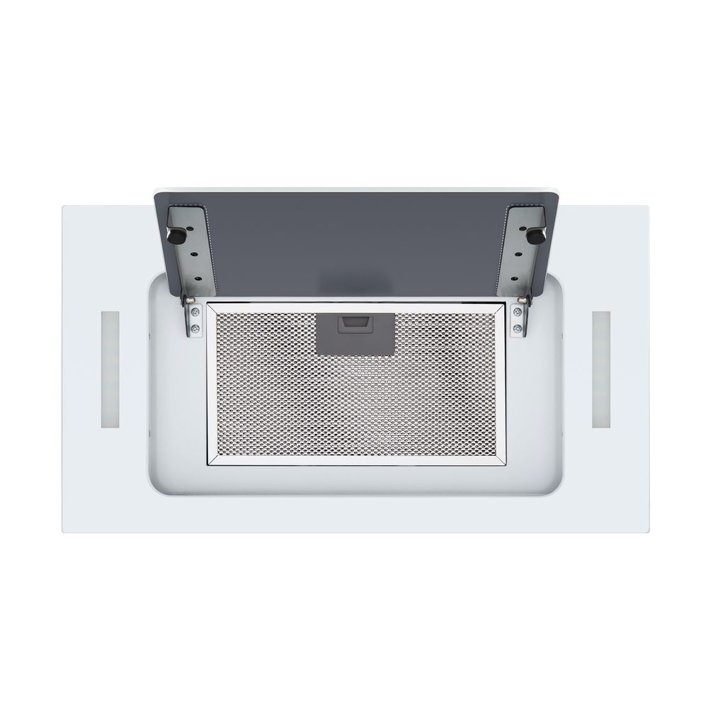 Лицевая панель стеклянная, жировой фильтр спрятан за тонированным стеклом. Вытяжка полностью встраивается в кухонный шкафчик над варочной поверхностью, данная особенность позволяет сэкономить пространство в интерьере
