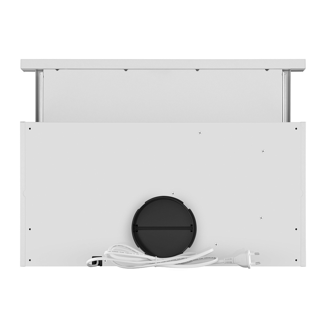 Управление Колыбельное 2-х скоростное управление. Особенности Телескопическая жировая решетка. Для работы вытяжки необходимо выдвинуть жировую решетку, данная конструктивная особенность создает широкую рабочую поверхность, что позволяет эффективно производить забор воздуха от плиты. Мощность мотора и максимальная производительность Полная потребляемая мощность мотора 102 Вт, максимальная производительность 520 м3/ч. Данная вытяжка может работать на кухне площадью до 20 м2. Уровень шума 45 Дб. Освещение Вытяжка комплектуется энергосберегающим LED освещением 2*1 Вт. Цвет Белый Монтаж Вытяжка предназначена для встраивания в кухонный шкаф.