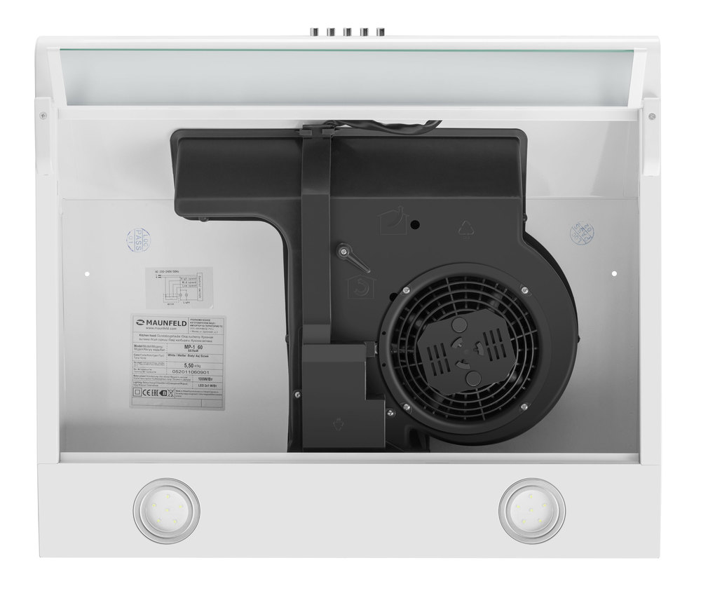 Кнопочное управление, расположенное на торце вытяжки, позволяет выбрать одну из 3-х скоростей работы вентилятора и включить освещение (две LED-лампы по 1 Вт каждая).