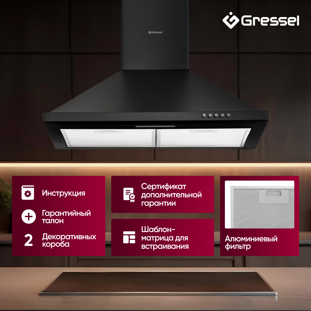 2 декоративных короба, жироулавливающий фильтр, обратный клапан, монтажный комплект,инструкция по эсплуатации.
